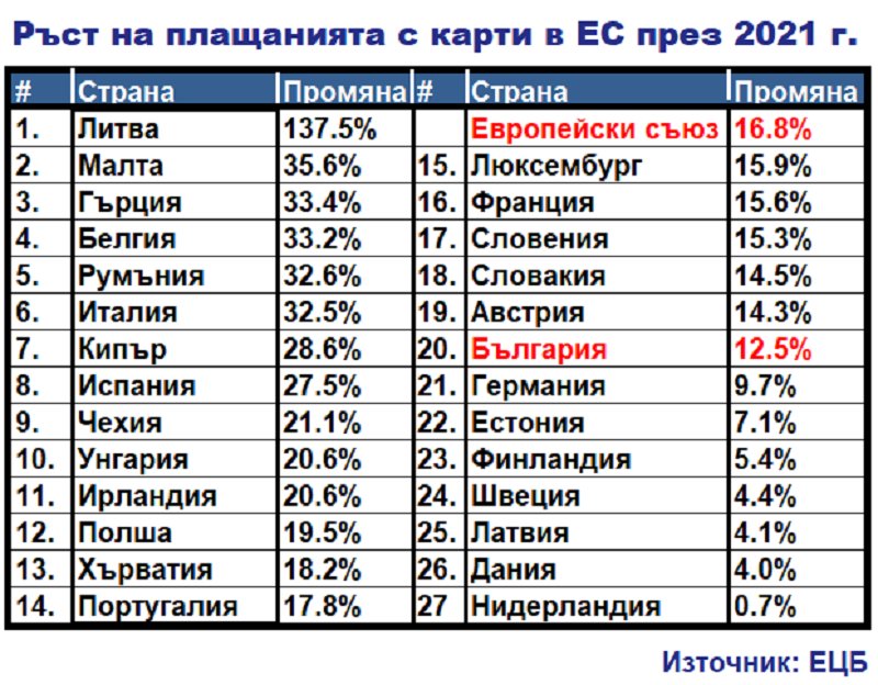 Обобщените данни на ЕЦБ показват, че България се намира на 20-о място в ЕС по ръст на плащане с карти (издадени от местни доставчици на платежни услуги) през миналата година в сравнение с предходната 2020 година. Това показва напредък, но недостатъчен. От таблицата по-долу става ясно, че най-слаб ръст е отчетен в Нидерландия, Дания, Швеция, Финландия (които са преди нас), но това е нормално, като се има предвид силно развитата в тези страни система за безналични разплащания, която действа от повече от 10 години.
