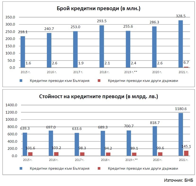 От данните на БНБ става ясно, че през 2021 година са реализирани 328.5 млн. броя кредитни превода за общо 1 180.6 млрд. лева, спрямо 286.5 млн. броя за общо 818.7 млрд. лева предишната година, което представлява нарастване с 14.65% на броя на преводите и с 44.20% на общата сума. За разлика от еврозоната в България съотношението на транзакциите, инициирани по електронен път спрямо тези на хартиен носител, също нараства, но в полза на хартиения носител. През 2021 г. транзакциите на хартиен носител са били 209.4 млн. броя, спрямо 181.4 млн. през предходната 2020 година, докато инициираните по електронен път са нараснали от 107.5 млн. броя през 2020 година до 125.7 млн. през миналата.